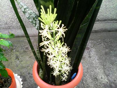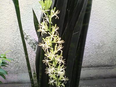 サンスベリアの花(虎の尾) 2007年9月26日更新 サンスベリア(虎の尾)に花が咲いて3日目です。 下の方から順に咲いて行くようです。 花の香りは、夕方は未だほとんどありません。 夜になると、強い香りがします。 2007年9月26日17時00分:今日がピークかな? 未だ、一番上が残っています。