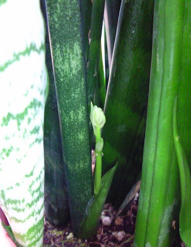 サンスベリアの花(虎の尾) 2008年8月2日更新 2008年8月2日:昨年とは異なる葉で、何か芽が出ています。※約8cm7月29日の雨(集中豪雨)で、葉っぱの中に、水溜りが出来ていたのですが、それが良かったのでしょうか?