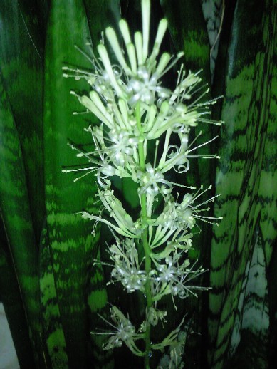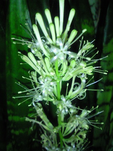 サンスベリアの花 開花6日目夜 2008年8月24日更新 2008年8月24日20時: 今夜も小雨の中、頑張って咲いています。 しおれた花と、新しい花が混じっています。 気温が急に下がったからか、新しく咲く花の数が少ないです。 その分、長持ちしそう。 でも、しおれた花の数の方が多いので、全体的には、あまり綺麗に見えません。 やはり、花は、一斉に咲いた方が、綺麗です。