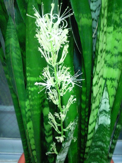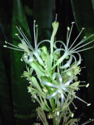 サンスベリアの花 開花8日目夜 2008年8月26日更新 2008年8月26日21時: 今夜も、パラパラと咲いています。 残りのつぼみは、後、数個です。 個々の花は、一夜限りで、翌日はしおれています。 このために、開花がピークを過ぎると、しおれた花ばかり目立ちます。