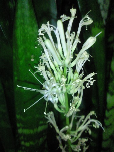 サンスベリアの花 開花9日目夜 2008年8月27日更新 2008年8月27日22時: 今夜は、1個だけ咲いています。 残りのつぼみは、後、数個です。 個々の花は、一夜限りで、翌日はしおれています。 しおれた花は、数日経つと、ポロポロと落ちていきます。