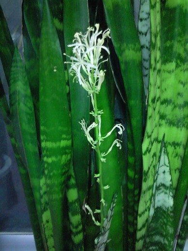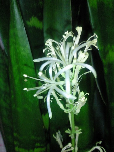 サンスベリアの花 開花10日目夜 2008年8月28日更新 2008年8月28日22時30分: 今夜は、2個だけ咲いています。 残りのつぼみは、後、1個です。 個々の花は、一夜限りで、翌日はしおれています。 しおれた花は、数日経つと、ポロポロと落ちていきます。 そして、幹だけになります。