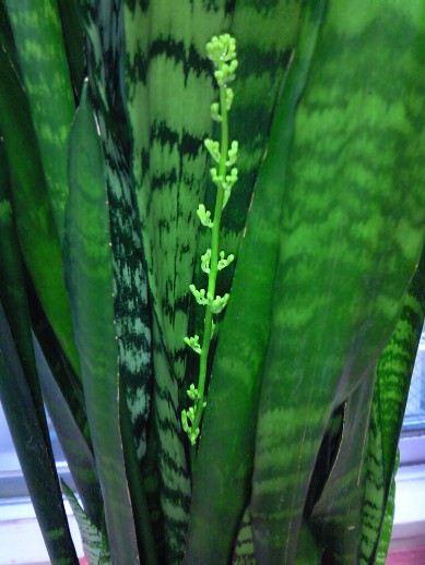 サンスベリアの花 2008年9月1日更新 2008年9月1日: 今年は、もう一箇所、別の所で、新しい花の芽が出ていました。新しい花の芽は、約43cm。 立派な花が咲きそうですが、周りの葉っぱが邪魔です。
