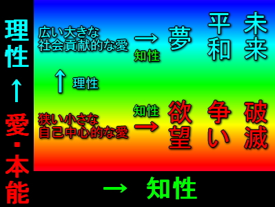 | (Japanese) 愛と夢の略図 自己中心的な小さな愛ではなく、理性を加えた大きな愛で、より良い人類の未来を願う心が、夢です。 人類の夢は、「より良い社会を、未来に残すこと」であるはずです。 個人の夢も、根底は同じはずです。 ![]() |