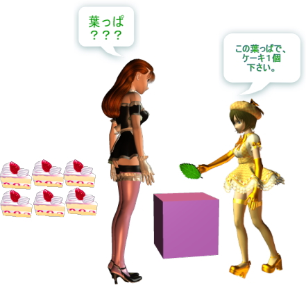 ![]() ↑※上のシーンの状況説明 ベルベルちゃん(10歳)は、大人が紙切れ(千円札)で物を買っているのを見て思いました。 「あんな汚い紙切れで、物と交換できるのなら、この綺麗な葉っぱで、もっと良い物と交換してもらえるハズ」 そこで、ベルベルちゃんは、綺麗な葉っぱを持ってケーキ屋さんに行きました。 ベルベル:「この葉っぱで、ケーキ1個下さい」 店員のメイちゃん(17歳)は、理解できず困っています。 |