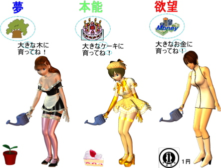 | (Japanese) 地球温暖化防止 3人3様 地球温暖化防止について、3人3様を表現して見ました。 ■地球温暖化防止のために、緑を育てる人。 ■地球温暖化を気にせず、本能に従う人。 ■地球温暖化対策で、お金儲けを考える人。 ![]() ★心優しいメイは、植物を育てます。 ★ケーキが好きなベルベルは、ケーキを育てます。 ★お金が好きなユキは、1円を育てます。 |